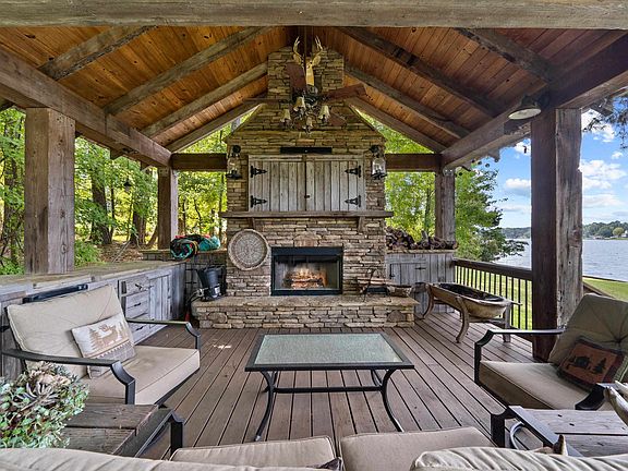 Stone fireplaceWood burning fireplacePine beam ceilingsOpen deckFloor-to-ceiling windowsSweeping lake viewsMetal roof
