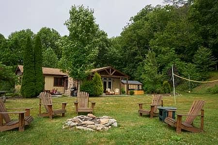 UNFURNISHED - pictures show with furniture but is now empty. Freshly painted home, 4 BR and 3 full baths, with new appliances, hardwood floors, wood burning fireplace, covered porch, patio, VIEW, 8 miles to Boone. Good closet space, private with FENCED yard. Master on main, central AC, firepit, and flat yard. Close to river for fishing and playing with private access. Valle Crucis school and school bus pickup at bottom of drive. Dogs allowed with $200 non refundable pet fee. No smoking. Owner provides water and sewage. Tenant responsible for fuel, lawn care and garbage. Services can be recommended for hire for lawn and garbage. One year lease required and $3000 deposit. Renter's insurance is required. Dogs are allowed with $200 per non-refundable deposit. Fenced yard, private.