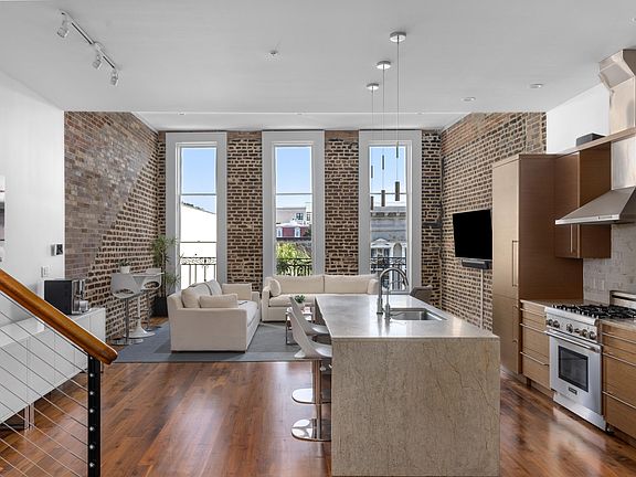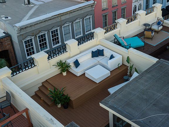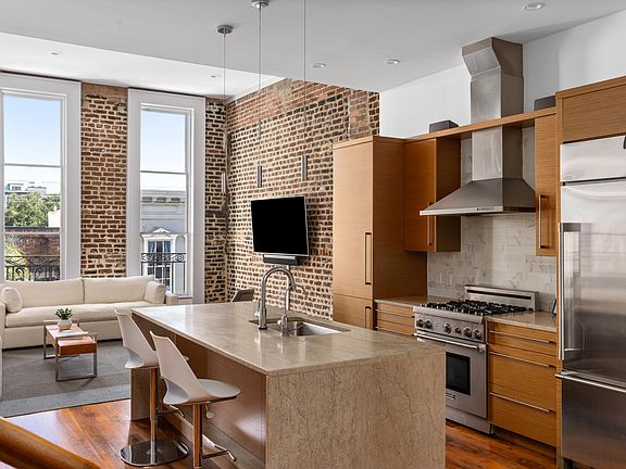 Rare offering of a truly luxurious penthouse condominium with private rooftop deck, overlooking Charleston's famed King Street. Davidson Lofts is one of the city's most elegant transformations of an antebellum building (circa 1800) into prominent residences featuring modern embellishments complimented by historic character and charm. The building has an elevator for convenience and this unit comes with a deeded parking space directly outside the back entrance. This stunning two story dwelling is highlighted by 13' foot ceilings, operable floor-to-ceiling windows, exposed brick walls, heart pine flooring, and LED lighting & smart lighting controls.The main floor features an expansive entertaining space with soaring ceiling heights, a gorgeous floating steel staircase with cable tie railings that is centered over a huge skylight which draws the eye to the two story opening to the second floor. Also on the first floor, a spacious guest bedroom with full bath provides privacy from the primary bedroom suite. The open kitchen is anchored by a large waterfall-style island finished with limestone countertops, custom cabinetry, a Thermador gas range with stainless steel hood, GE Monogram refrigerator, Bosch dishwasher, and an Enagic water filtration system. The primary bedroom (with en-suite bath) is on the second floor and is outfitted with motorized window treatments with blackout blinds and two closets with custom storage solutions. The second floor also provides an executive office/den which is flooded with natural light and overlooks the private rooftop deck, a half bath for guests, and the laundry room. The large rooftop deck features trex decking, adjustable lighting, audio components, and an elevated seating area with views of the iconic Ravenel Bridge.