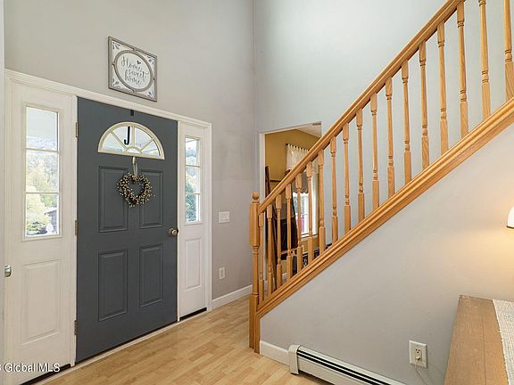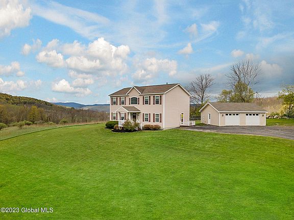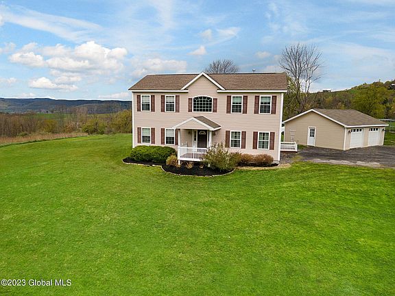 Impressive 2400sqft 3-bed, 2.5-bath 2-Story Colonial nestled on over 2ac on quiet dead end road in the middle of picturesque Schoharie Valley. Home features a bright, spacious living room w/ gas fireplace, formal dining room and beautiful eat-in country kitchen w/ tons of counter & cabinet space, island, stainless-steel appliances and breakfast nook. Primary bedroom w/ walk in closet & private bath w/ double sinks and soaking tub; office w/ built in desks could be used as a 4th bedroom. Sliding glass doors off kitchen lead to large back deck w/ hot tub, landscaped open yard & spectacular mountain views. Main level laundry, 2 car detached garage, shed, work shop, fenced in garden & chicken coop. Only 2 miles to the Village of Cobleskill and to I-88 for easy commute to the Capital District!