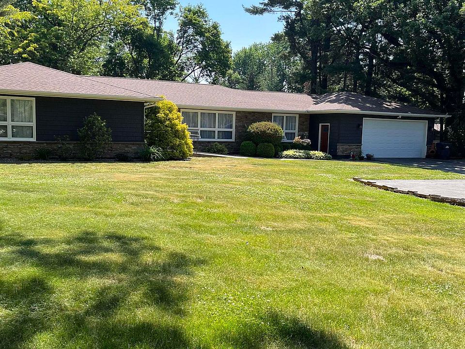 Awesome 4 bedroom centrally located ranch on 140' x 250' lot with over 3500' of finish with a 30' walkway right as you come in the front door overlooking the huge family room with oversized stone fireplace, wet bar, vaulted wood ceiling with beams and french doors that open to the new patio. Many closets with the hall closet in cedar. Beautiful stone accent wall in the living room with an electric fireplace, shelves and lighting. Living room is open to large informal dining room which in turn is open to the kitchen with cherry cabinets in a blackwash, under and over cabinet lighting, large island wrapped in stone, granite counters, 2 pantries and a black farm sink. Main floor laundry. Bath in main hall has heated floors. Master bedroom has a full bath and large walk in closet. Home has solid 3 panel doors.