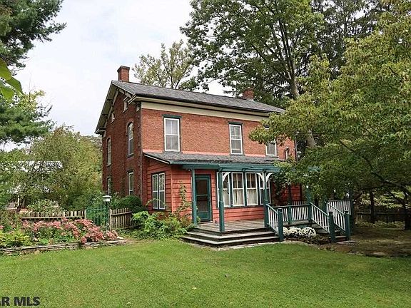 This classic Victorian residence built in 1867 during the post-Civil War building boom showcases Italianate details and captivating old-world charm. Upon entering you'll be captivated and imagine stories of days gone by. Adore the original French-style front door with transom window, hardwood floors, soaring ceilings, expansive windows and a delightful sunroom. Stainless appliances, a stylish back splash and new lighting adorn the kitchen. A generous dining room, living room with fireplace and full bath complete the main floor. Ascend and discover an updated owner's en suite, three additional bedrooms, an all-new bath and convenient laundry. Value two outstanding garages, plus workshop/studio areas w/wood burning stove. Enjoy outdoor living areas amongst mature trees/perennials and easy access to the library, park and Grange Fair grounds. Note: Rebuilt front porch, deck and patio addition, playhouse, basement mitigated for dampness.