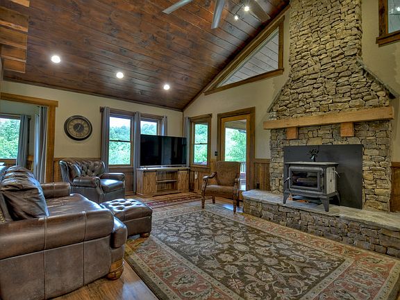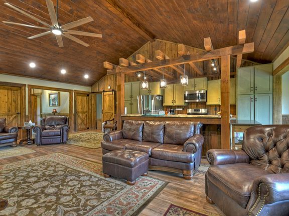 7+ acre mini farm situated just beyond the outskirts of Blue Ridge! Craftsman style home featuring a harmonious fusion of natural wood & elegant sheetrock finishes. The expansive great room serves as the heart of the home, boasting a floor-to-ceiling stone fireplace w/ a wood stove & offering seamless access to a large covered porch. The open kitchen is a chef's delight, featuring an abundance of cabinetry, stainless steel appliances, & an adjacent dining area. The main level is crowned by the primary bedroom, featuring an ensuite bath w/a tile shower, spacious closet, & an abundance of natural light. Completing the main level is a charming 1/2 bath. Full finished terrace level encompasses a large great room, 2 additional bedrooms, full bath, & a laundry/ storage area. This remarkable property presents a huge pole barn w/convenient amenities such as a 1/2 bath, washer/dryer hookup, & a dedicated workshop space. Additionally, an enclosed area is thoughtfully designed to house a chicken coop & accommodate extra livestock. 3 RV pads are available, one complete w/ cover, deck, power hookup, water & septic.