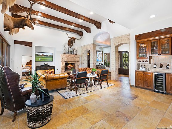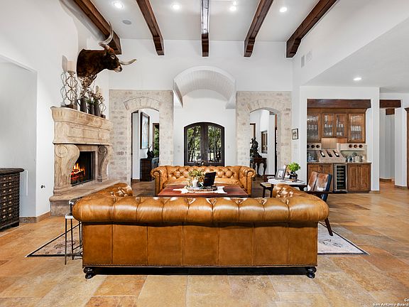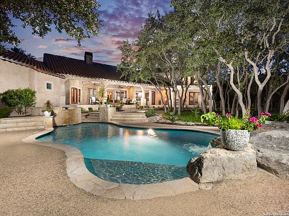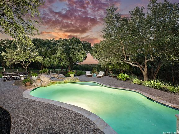 This Stunning home with private gated entrance is situated in the sought after Cordillera Ranch subdivision with approximately 4739 +/- square feet of living space, four bedrooms with four and half baths, situated on 3.25 manicured wooded acres. Upon entering you will step into the foyer that is complemented with a custom finished barrel ceiling with recessed lighting and stone pillars that accent the entrance to the great room. The grand entrance leads to living, and family areas with a beautiful massive cantera stone fireplace, high ceilings with custom wooden beams which give this home a rich, warm feeling. Enjoy the beautiful large living space with breathtaking views through windows from the living room that showcase incredible scenes into the private backyard with pool and hot tub that showcase fabulous views. Soaring ceilings, travertine, hardwood flooring throughout, windows are just a few of the features that complement this home. Wonderful entertaining area off the living room is perfect for additional seating and includes outdoor access. The kitchen includes spacious custom cabinetry with granite counter tops, two islands: one prep island with copper sink, and one main half circular bar type island. Kitchen also boasts built in microwave, oven, warming drawer, propane Thermador cooktop, and large walk in pantry with extra storage. The luxurious primary suite has spacious living space which is complemented with natural lighting and private outdoor access to the patio and pool area. The primary suite also includes two double walk-in closets, and a spectacular custom ladies closet that is a must see. granite counter tops and double sinks in the primary en suite to include an oversized tub, open shower, and bidet. Secondary bedrooms are all spacious with walk-in closets and storage space as well as en suite bathrooms. This one and half story has one oversized bedroom upstairs with a full bath, private walkout patio, including a huge walk in closet that could be modified into a media/game room. Home includes a grand stately office/den which allows for a work from home space. Sound system throughout the home and patio areas, that can be controlled remotely cellularly. Rest and relax while you enjoy the privacy of your backyard that is perfect for entertaining, with mature oaks, landscaping, to include multiple sitting areas with lots of scenery and resident wildlife. Backyard offers wonderful entertaining areas with built in Cal Flame Grill, the covered patio spanning the length of the home and separate fenced area for dogs. Property is completely fenced, updated cellular controlled sprinkler system for all grass areas and flower beds, double pane windows, custom outdoor landscape lighting, and endless mature trees are a few additional features of this magnificent home.