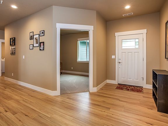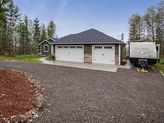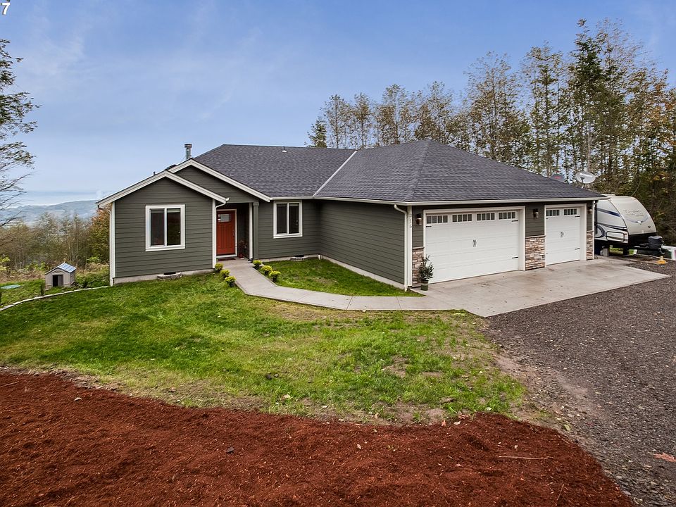 GORGEOUS single level custom home on 5 ACRES! Built in 2016 and barely lived in since. At over 2300 SF this 3 BR (plus bonuses) 2 BA home offers an open floor-plan w/ tons of amenities! High ceilings, granite, hardwood floors, massive walk-in pantry, huge master suite (w/ bathroom to die for), 2 bonus rooms, wired for generator, 3 car garage, RV parking, and a covered deck to soak up AMAZING panoramic views of city and Columbia River!