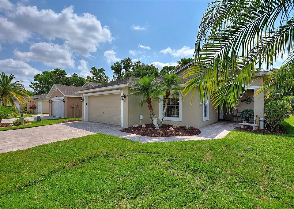 One or more photo(s) has been virtually staged. Partly-furnished RidgeCrest 2/2/Den model with Florida room overlooking conservation, located just 0.3 miles from the High Vista private clubhouse. New roof to be installed prior to closing. Expanded brick paver driveway and walkway to portico front entry with a full-view storm door and overhead sunburst transom window. Bright central great room has 10-12 FT cathedral ceiling, wood floor and a decorative ledge over a wall of patio doors to the south-facing Florida room with tile floor and sunshades over Florida-glass windows. Eat-in kitchen has crown-molded upper cabinets with end caps, roll-out drawers in lower cabinets topped with beveled-edged laminate, ceramic tile-on-point backsplash, pantry and white appliances including a Bosch dishwasher. Wood floor in kitchen extends to adjacent drop zone, then to laundry room with washer, dryer, installed cabinets and retractable screen to garage. Owner's suite has 10-11 FT tray ceiling with sky tube, french door to Florida room, 7x6 walk-in-closet and private bathroom with sky tube. Split bedroom design offers a cozy guest suite with tray ceiling and private entry to full bath with linen closet. Additional linen closet in hallway between guest suite and den. 20x20 garage has electric screen door, Genie opener with keypad entry, installed cabinets, shelves, utility sink and pull-down wood ladder access to attic. Installed Kinetico water system. Installed water pressure reduction unit. HVAC replaced 2012, last serviced 2/2023. Seller will contribute up to $600 at closing for a home warranty of Buyer's choice. Ridgewood Lakes is a golf cart friendly community. Sold As-Is. $190 monthly High Vista HOA fee includes Spectrum internet and basic cable TV with 2 cable boxes, lawn mowing and exclusive access to resident-owned 12,000 SF private clubhouse and amenities. $416 semi-annual Ridgewood Lakes HOA fee provides 24x7 staffed security gate and master association-owned private road maintenance. Adjacent to 18-hole White Heron Golf Club with restaurant, privately owned and open to the public. High Vista is a 55+ community with outdoor heated pool and spa, fitness center, library, pub & many organized activities. Pickle ball, tennis, bocce and shuffleboard courts. Miles of biking and walking trails within Ridgewood Lakes gated community. Shopping, Disney, Universal, Orlando & Central FL entertainment nearby, easy access to I-4, medical facilities, airports & Sunrail Station. Advent Health hospital is 3 miles away.