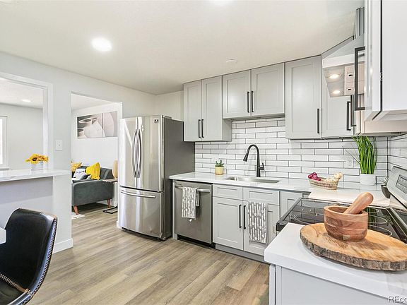 Welcome to this beautifully updated ranch style brick house on a corner lot with a basement that has a private entrance, 3 car garage and NO HOA. This house offers fully upgraded 4 bedrooms and 2 bathrooms with oversized detached 2 car garage and additional 1 attached garage. Upon entrance on the main floor, you will find luxury vinyl flooring throughout, fresh paint and Kitchen with brand new cabinets, quartz countertop, stylish backsplash, and stainless steel appliances. The finished walkout basement with brand new carpet and tile flooring throughout offers 2 bedrooms, 1bathroom, additional living room, and laundary with wet bar . This walkout basement set up opens up possibilities for extra leisure space, extended family or house hacking. The fenced back yard provides plentiful space for entertaining and gardening. AC, Furnace, and all windows are recent and in good shape. This area is close to Anschutz Medical Campus, UC Health, VA hospital, Children Hospital, highways, dining, shopping, and entertainment. Schedule your showing in person today!