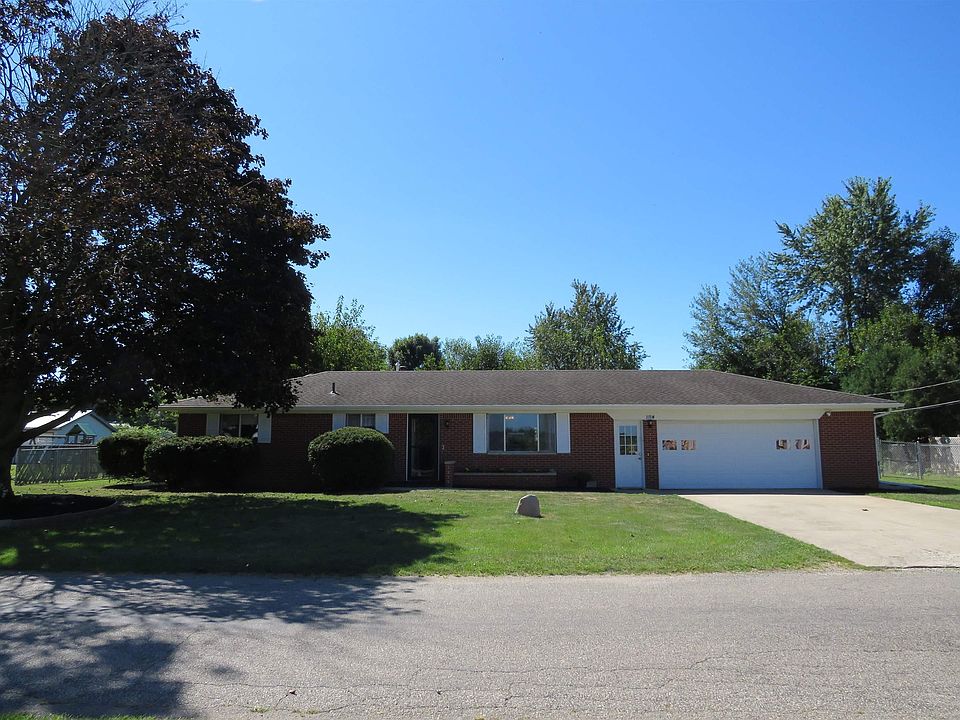 Charming brick ranch home with over 1,100 sq ft of comfortable living space on nearly half an acre, featuring mature trees including an apple tree! Step inside to an open-concept floor plan with original hardwood floors. Recent updates include removing the wall between the kitchen and living room, fresh paint, and adding a custom breakfast bar with four new barstools. The kitchen boasts freshly painted cabinets, new hardware, a new sink and faucet, and stainless steel appliances including a dishwasher, stove, and hood, complemented by laminate flooring. Adjacent to the dining area is a spacious laundry room with ample storage and organization options. Down the hall, two bedrooms have hardwood floors, and the updated full bath features a new vanity top, toilet, paint, and laminate flooring. The fenced-in backyard is ideal for family gatherings or pets. The home also offers excellent curb appeal with a spacious driveway leading to an oversized two-car garage, providing ample parking for guests and extra vehicles. Hurry and book a showing before it's gone!