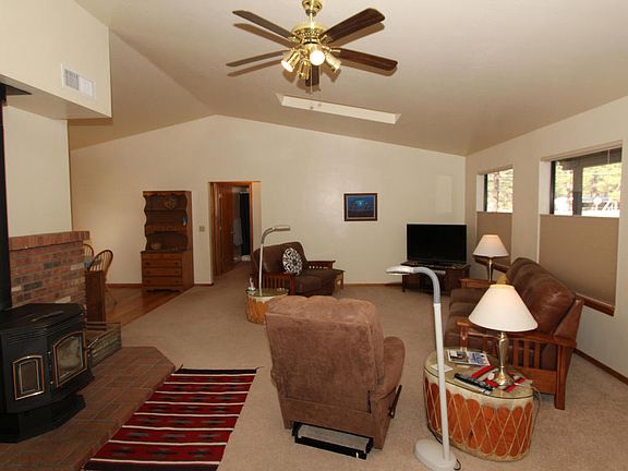 Ready to go! Move in ready in this well maintained single level home in Kachina Village with 3 bedrooms, 2 baths, 1,580 sq. ft. and 2 car garage. Split floor plan, extra insulation for added energy efficiency and vaulted ceiling and skylights for the bright open feel. Skip the mess of a traditional wood stove and enjoy the warmth and ambiance of the Quadrafire pellet stove. You'll just love the walk through kitchen with large pantry and breakfast bar. The 10,002 sq. ft. (0.23) nicely treed lot is partially fenced and is low maintenance. There is even a separate building to store your BBQ grill or other items as well as a backyard workshop with power. Easy access to Forest Service across the street. Don't miss out on this wonderful home or forget to watch the virtual tour!
