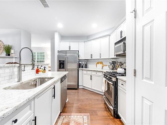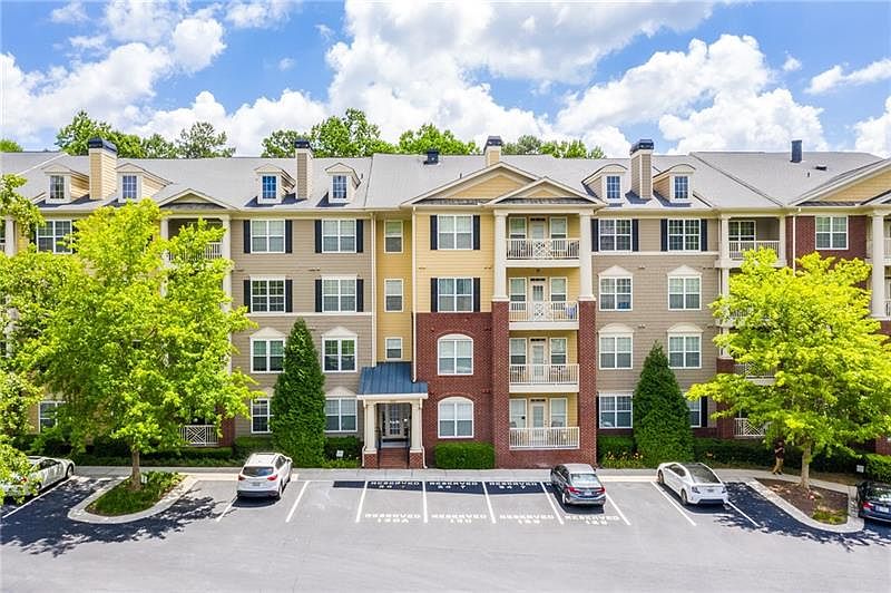 Rare 3 bdrm corner condo in Marietta's Flats at Riverwalk! Kitchen boasts SS appls, leathered granite, white cabinets. Nat. light floods into living rm, which feats a dbl-sided gas fplace, connecting it to the dining rm. Mstr ste is lovely, incl lg walk-in closet w/ custom built-ins & spa-like mstr bath w/ dual vanities, jetted tub & sep shwr. Addl bedrms well-sized & bright. Ideal outdoor living on lg covered balcony. Custom closets through out the home. Great amen. pool, clubhse, & gym. Convenient location close to interstates, shopping, restaurants, & SunTrust Park!