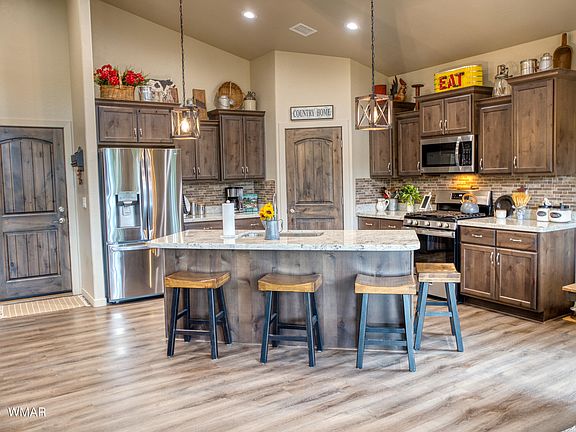 This beautiful Oak model custom home with a 2 car garage would be perfect as a permanent residence or a cabin getaway in the desirable White Mountains. It sits on .29 acre, is landscaped and backs up to USFS. This 3 bedroom, 2 bath offers high end finishes both inside and out, some of which include a vaulted ceiling, gas fireplace, granite countertops, barn doors, kitchen pantry, double vanity, and a walk in tile shower. The exterior offers a metal roof, rain gutters and down spouts, paver driveway, fenced in pet enclosure, custom metal security door and a shed for extra storage space. The covered back deck is the perfect place to entertain friends or just relax and watch the wildlife in the tall pines. Creekside has the security of a gated community and easy access to shopping and dining. Come and enjoy the cool mountain air and