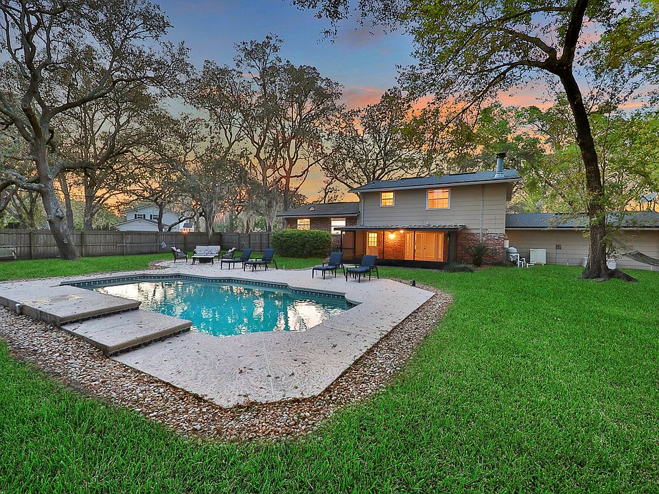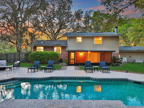 PRIVATE SANCTUARY OF COMFORT AND CHARM with ROOM to ROAM. Beautiful and spacious both inside and out, this POOL home consists of 4 beds/3.5 baths/2 car garage. 1st Floor Master and a cabana half bath. Enjoy gatherings in the generously-sized living room with cozy fireplace and screened enclosure overlooking the glimmering pool. The first floor kitchen oozes chic, southern, sophistication and quality. This home is a calm oasis with a neutral color scheme and rich caramel-toned timber floors contributing to the character and charm. Upstairs, you will find the remaining 3 bedrooms and 2 bathrooms. This well-appointed family home will appeal to anyone looking for extra space and storage. This swoon-worthy property includes goodies like a tree house, a rope swing, a two story shed, a basketball court, and a pavered driveway. Enjoy the sunny corner lot (.55 acres) and fully fenced lush yard filled with matured oaks and hearty landscaping.