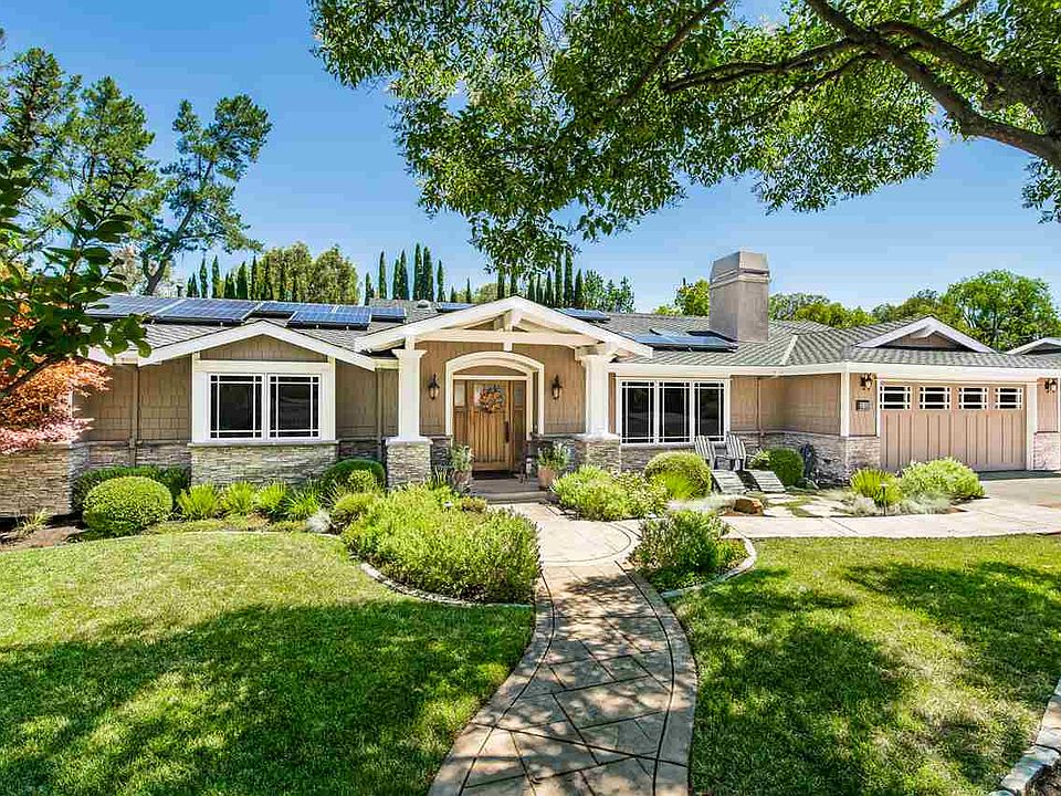 This single-story westside Alamo home begins with an enchanting frontage. Through a pedestrian gate and along a beautifully landscaped meandering path guests will pass a tree swing as they arrive at the front door. The meticulously cared for home offers four-bedrooms and three-baths. The expanded open concept kitchen and living room are filled with light and views out to the flat backyard with clearly defined spaces for gardening, pool/swimming, dining al fresco and lawn play. The family room has a cozy fireplace surrounded by custom built-ins and a large picture window looking out over Adirondack chairs on the front porch. Down the hall are three secondary bedrooms of ample size, one en suite. Within the primary bedroom retreat there is a sizable room that could be an office, gym or a customized closet. The private half-acre flat lot offers a large blank slate for your dream backyard. The home backs to the Iron Horse trail and is less than half a mile to the Alamo Shopping Center.