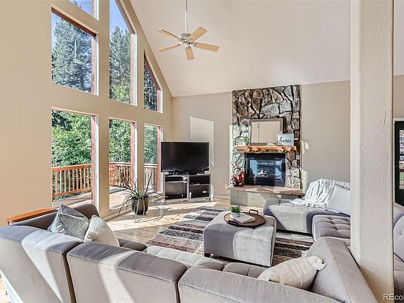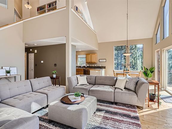Your home search ends here at this incredible mountain home! Enter the house and you'll instantly be impressed by the vaulted ceilings and wall of windows, allowing the great room to be bathed in natural light. The tall ceilings throughout the home make you feel like you're living large! The family room area has plenty of space to accommodate a comfy sectional couch so you can get cozy by the gas fireplace. The open concept floor plan allows for easy entertaining, where the cook can be part of the action when guests are present. The kitchen has lots of storage and has GE Profile stainless steel appliances, including a gas cooktop, dishwasher and French door fridge. There are two bedrooms on the main level and both are a great size to be used as a guest bedroom or home office. The lower level has fresh paint and tall ceilings. It’s a terrific rec room to play pool or foosball or watch a sports event on TV. The back room could be a 4th bedroom, or easily used as a home theater. The home's primary suite is on the second floor of the home and includes a walk in closet and ensuite bath with shower, soaking tub and double sinks. The upstairs loft is a perfect place for reading, a home office nook or to take in the views. The home has a two car garage, and don't miss the chicken coop tucked behind the garage! Kings Valley offers an easy transition to mountain living with city water and sewer services (no well or septic to maintain) and county maintained roads. You're minutes to retail in Conifer, close to Staunton State Park and endless Jeffco Open Space parks for hiking and mountain biking, plus world class fly fishing on the South Platte River. Make your dream of mountain living a reality today!