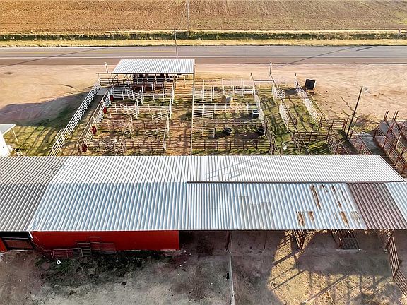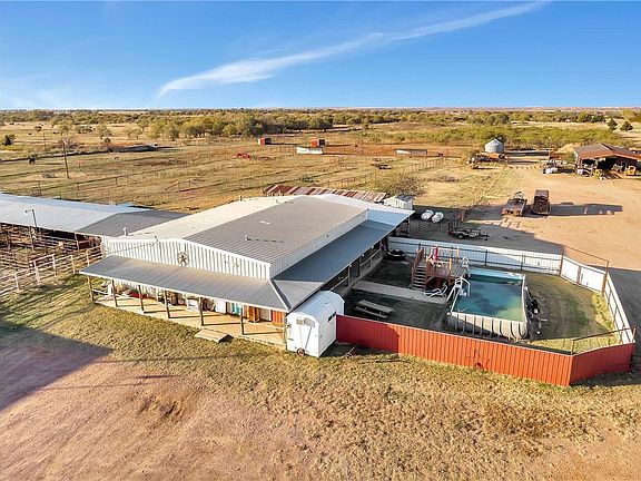 One of a kind property . This 2896 sq foot home, was originally the Mangum Livestock Sale Barn , converted to a 3 bedroom 3 bath home. Home has spacious rooms , an attached carport , fenced yard with above ground pool and a large covered front porch. Property is 8.32 acres with iron pens 4 large pens 100 X 40 and 25 smaller pins. 2 loading chutes, hydrolic working chute , and covered sheds. There are 3 large grain bins , a work workshop/barn with concrete flooring and electricity and a roping arena with roping chutes. This property has multiple uses , would appeal to cattle or equine business . Would make a great pre-conditioning facility , a vet office, holding or resting pens, or home for cowboy or rodeo family. Possibilities are endless. Plenty of room to to get semi trucks in and out of property . Security system remains with the property.
