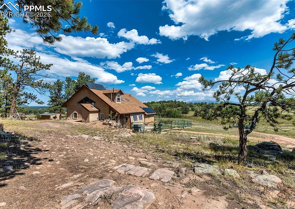 Wide open adventure awaits you at this rare Colorado home bordering Pike National Forest land. You will want to embrace this opportunity to enjoy sustainable living, unmatched privacy, and a true Colorado mountain lifestyle. This 2 bedroom/2 bathroom custom straw bale home on 10 private acres offers DIRECT National Forest access through two gates on the property. Experience solar powered off grid comfort and custom handcrafted details throughout the home. Elegant features like high vaulted tongue and groove ceilings, ceramic tiled floors, earth toned colors, skylights, Pikes Peak views, and plenty of natural light create an inviting environment. The open floor plan combines a stunning great room, dining space, sunroom, and kitchen into a multifunction space with a seamless layout. The kitchen shines with tiled and solid wood counters, custom backsplashes, solid wood cabinetry and stainless steel appliances. The sunroom brings in passive heat during the day while radiant baseboard hot water heat keeps temperatures even and cozy year round. The great room wood stove adds warmth and mountain charm while deep straw bale walls in the primary wing provide character and exceptional insulation. The main level primary bedroom has a custom tiled ensuite soaking tub while the second floor bedroom is the perfect private guest bedroom with extra storage space. Outside, a 14 X 40, four car garage with an oversized bay door has multiple parking options for your cars, trucks, and tractor. Room for all your toys. A greenhouse, a chicken coop with attached run, and garden space create the perfect setup for hobby farming. Horse lovers will enjoy the 24 X 25 barn with stalls and the level green pastureland for grazing. Stunningly beautiful land with aspens, pines, meadows, and willows. Strong 10 GPM well. Minutes to Eleven Mile Reservoir for fishing and boating. Hunting, riding, hiking seconds away. Experience world class recreation right off the back porch step. Year round beauty!