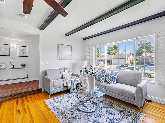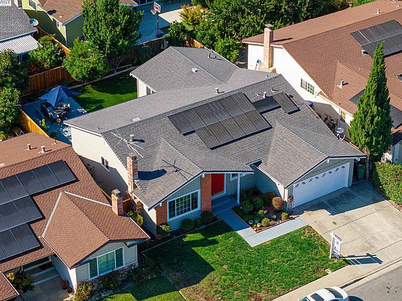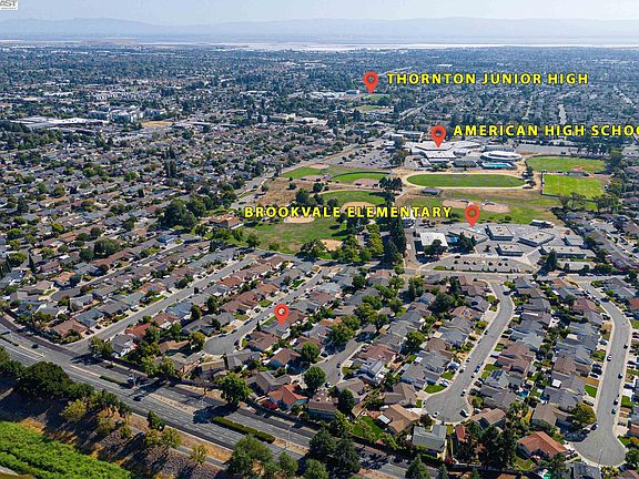 Pamper yourself in the highly sought-after Brookvale neighborhood on a quiet court location. It offers 4 beds, 2 baths, 1830sqft, 5800 sqft lot with high-quality upgrades. The gourmet kitchen open to the family room has a 7-foot preparation island with waterfall quartz countertops, white maple cabinets, recessed lights, stylish glass tile backsplashes, lazy Susan roll-out drawers, an office desk, stainless steel appliances, gas range, and a powerful hood. The Spacious master room has recessed lights, mirror closet doors, and a fully renovated bathroom with a double-stall shower, marble countertops, tile floors, tile shower enclosures, and a water-conservation toilet. Other fine features include an owned solar system, a new Lenox furnace with 4-ton AC, New R-38 insulation in the attic and new insulation around heating ducts, a new water heater, two double pane sliding glass doors to access backyard, painted exterior and interior. A serene backyard is truly enjoyable with a concrete patio, artificial turf, new fencing, and harvested fruit trees (lemon, plum, pomegranate, blueberry, and orange). An easy commute to HWY 880 and Dumbarton Bridge. Close to shops, parks, restaurants, Quarry Lakes, Bart Station. Walkable to Brookvale Elementary, Thornton Middle, and American High.