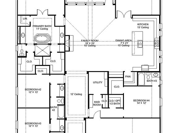 Home office with French doors set at entry with 12-foot ceiling. Extended entry leads to open family room, dining area and kitchen with 17-foot ceilings throughout. Family room features wall of windows and a wood mantel fireplace. Kitchen features generous counter space, walk-in pantry, double wall oven, 5-burner gas cooktop and island with built-in seating space. Primary suite with wall of windows. Double doors lead to primary bath with 11-foot ceiling, dual vanities, freestanding tub, separate glass-enclosed shower and two walk-in closets. Game room with French doors features wall of windows. A guest suite plus abundant closet and storage space add to this open one-story design. Extended covered backyard patio with 16-foot ceiling. Mud room off three-car garage.