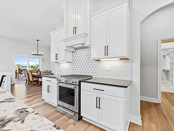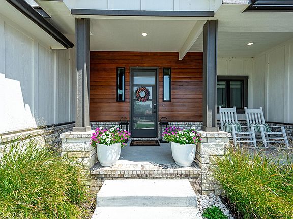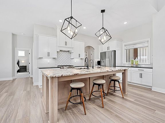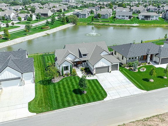 Welcome to this stunning home built in 2022, where modern luxury meets thoughtful design. This beautifully crafted home offers a spacious and inviting split-floor plan, featuring 3 generously sized bedrooms and 2 elegant baths on the main floor. As you step from the front porch and through the beautiful front door, you'll be greeted by soaring vaulted ceilings that create an open and airy atmosphere, complemented by the abundance of natural light that floods the living spaces.The heart of the home is the expansive living room, where a cozy fireplace adds warmth and charm, perfect for gathering with family and friends. Adjacent to the living area, the dining room seamlessly flows out to a covered wood deck, offering breathtaking views of a serene lake—ideal for enjoying morning coffee watching the sun rise.The chef's kitchen is a true delight, with a huge island with bar seating, granite counters, gas range, coffee bar, soft close cabinets/drawers and a large walk-in pantry. There is a convenient drop zone right off the garage, making everyday living effortless. The luxurious master suite is a private retreat, featuring a spa-like bathroom with a huge walk-in shower, double vanities with quartz counters, separate water closet with extra linen cabinets and an adjacent laundry room directly off the spacious master closet. The laundry room has a sink and extra cabinet storage. On the opposite side of the house from the master, you'll find two other bedrooms, a hall bathroom, a coat closet and 2 linen closets. A versatile flex room has limitless options for use - perfect for a home office, play room, or exercise room. The flex room has a powder bath with a linen closet. It has a walkout door to a large patio and the beautifully landscaped, fenced backyard. You will love that the yard has a sprinkler system on an irrigation well, and there is an oversized 3 car garage. Back inside, the viewout basement extends the living space, offering a cozy family room with a second fireplace, two additional bedrooms, a full bathroom, and a large wet bar. There is also a linen closet, closet under the stairs and large storage room in the basement. Fontana is conveniently located one mile from the restaurants and retail of New Market Square, but off 119th avoiding the busy traffic and noise. Fontana has a neighborhood pool and playground, and is located in the Maize School District. This property is the epitome of modern living, with every detail carefully considered for comfort, convenience, and style. Don’t miss the opportunity to make this wonderful house your forever home.