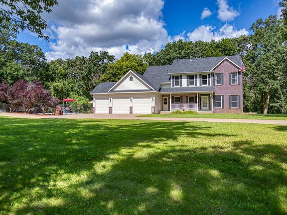Take a look at this two story colonial walkout situated on 6.59 acres surrounded by beautiful mature trees and has Rum River frontage. This home has been very well maintained and shows pride in home ownership! It offers 4 BRs, 4 BAs, an open concept floor plan, and 18 ft ceilings in the main level great room! Wood burning fireplace accents the great room on the main level. A two sided gas fireplace in the primary bedroom. Enjoy a huge family room with walkout to the backyard plus a 12 x 20 patio to take in all that nature has to offer. Main level includes a 12 X 24 deck that wraps around to the pool! Plenty of storage with an attached three car garage. Nice area next to the driveway to add an out building! The roof was new in 2023. Features hardwood floors on main level, a main floor laundry, and maintenance free exterior. Great location with quick and easy access to Hwy 169. Available for a quick close!