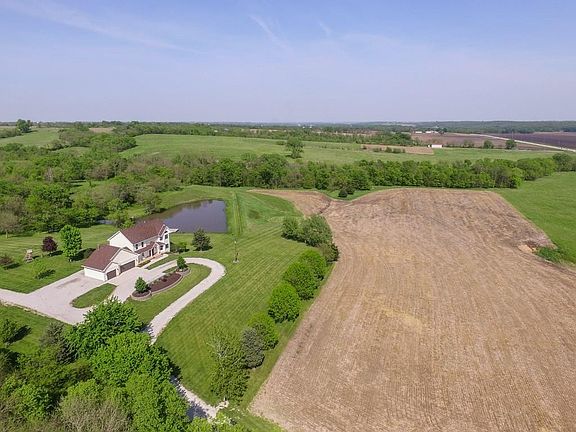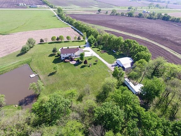 Gorgeous views on this acreage w/ 6 acres m/l with access to stocked pond w/dock, two outbuildings, and 5 bedroom/3.5 bath 2 story home. ADDITIONAL 22 ACRES M/L AVAILABLE! Location is perfect - on pavement & within 20 minutes from Jordan Creek. Home boasts Great room w/ natural light & gas fireplace and an updated kitchen w/ quartz, mosaic backsplash, pantry, new lighting, under/over cabinet lighting, & high-end appliances. Other features include: beautiful solid doors, hardwood throughout kit/dining, bedroom/office on main level, new roof in 2014, master suite w/ great views, tray ceiling, walk-in closet, & granite dual vanity, finished LL w/ wet bar, 2nd fireplace & bedroom & bath & 2nd laundry hook up, private setting that over looks the valley and backyard that overlooks the pond and timber, 30x45 and 20x30 outbuildings offer storage or be converted back to stalls for horses, abundant wildlife, and more! Winterset schools or open enroll in Martensdale schools.