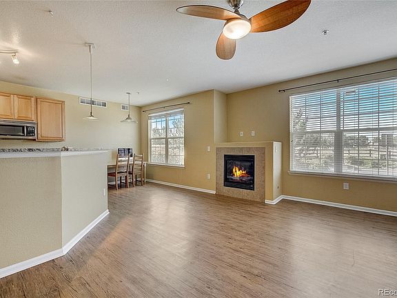 Rare opportunity with a garage. Fantastic ground floor condo in the picturesque Blue Sky at Vista Ridge community! This end unit condo offers an unparalleled lifestyle accentuated by a beautiful mountain view. Upon entry, be greeted by the inviting ambiance created by the abundance of natural light that illuminates the expansive living space, adorned with pristine laminate flooring throughout. The open concept layout gracefully connects the spacious living area, adorned with a charming gas fireplace, to the dining area and kitchen. The generously-sized kitchen is a culinary haven, featuring granite countertops, stainless steel appliances, ample cabinetry, and a layout ideal for both entertaining and everyday living. The living quarters are intelligently designed with split bedrooms situated on opposite ends of the home, offering enhanced privacy. The primary suite features a private patio, ensuite bathroom, and walk-in closet. A second bedroom, equally inviting, also offers a walk-in closet and easy access to a beautifully appointed full bathroom. Both patios are equipped with additional storage and are perfect for enjoying the serene surroundings. For added convenience, this home includes a detached one-car garage and is thoughtfully equipped with features like no steps or carpet, ensuring easy mobility throughout the residence. Recent updates, such as new dining room windows, a new garbage disposal, granite countertops, a new roof, and a programmable thermostat, underscore the meticulous care and attention given to this home. Blue Sky at Vista Ridge offers a well-maintained community adorned with a range of amenities, including a gorgeous pool, club house, and fitness center. Enjoy the convenience of being within walking distance to verdant green spaces, local restaurants, parks, and schools, enhancing the appeal of this already captivating property!