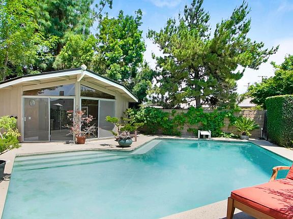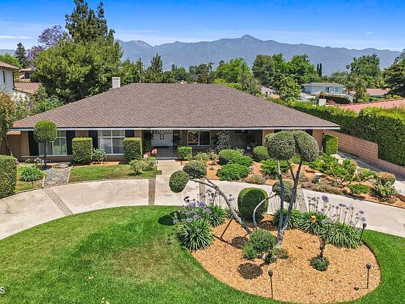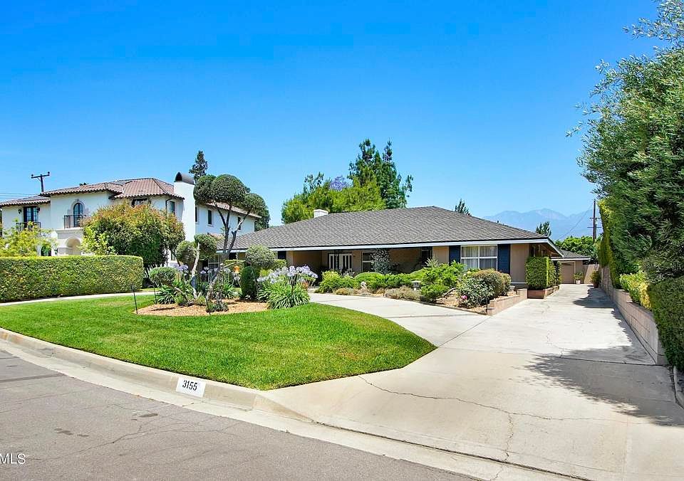 San Marino school. Nestled among the estate homes in the prestigious Pasadena neighborhood, this single-story Mid-Century Modern gem is located at the end of a tranquil cul-de-sac. Set on approximately 15,454 sq.ft. of park-like grounds, this home boasts a spacious living area with an open floor plan that allows natural light to flow freely throughout, making it perfect for entertaining. The entry leads to a spacious porch with views of the front yard. From the foyer, you step down into the open living room, which features custom French shutters, a fireplace with a floor-to-ceiling marble hearth, and garden views through the patio area. The kitchen includes custom cabinets, a Viking cooktop, high-end appliances, and granite countertops. Adjacent to the kitchen, a casual dining room overlooks the front yard, while the formal dining room, complete with a chandelier and large windows, faces the backyard.The east wing houses a bedroom suite with a bathroom, family room, and laundry room. The expansive family room features a fireplace, custom built-in cabinetry, and a hideaway wet bar. The laundry room has ample storage and a washing sink with direct access to the garage and driveway. The west wing includes the spacious master bedroom suite, a full bathroom, and two bedrooms. The master suite offers mirrored wardrobes, a dressing area, and direct access to the patio. The master bathroom features double sinks, a tub, and a walk-in shower. Additional amenities include recessed lighting, custom molding, hickory engineered wood flooring, sky lights, and central air conditioning.The property also includes an oversized three-car garage, a large driveway with a turnaround area, sprinkler system, circular driveway, and more. There is a separate deck with a swimming pool and pool/guest house with open beam ceilings. The pool area offers outdoor entertaining options with a built-in fire pit and barbecue area. Enjoy the pine trees and mountain views from this home, located near schools, parks, and various amenities.
