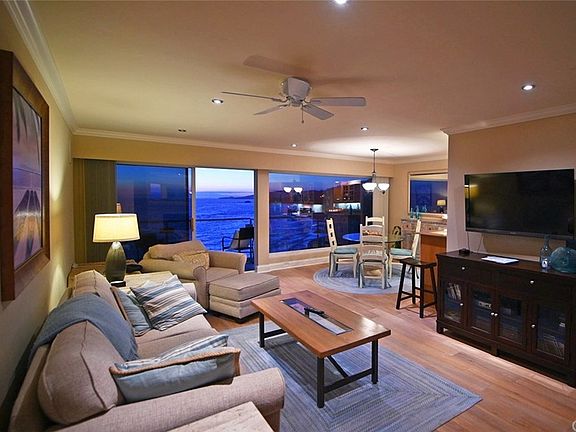 Unquestionably one of the most emotionally stunning locations in the famed Table Rock community perched on a rocky peninsula that juts out into the Pacific. This spectacular west facing unit offers mesmerizing views of Catalina Island, year round golden sunsets, north coast white water and city light views to Palos Verdes. The jaw-dropping views of crashing waves and white sandy beaches below are simply breathtaking from every room. This one-of-a-kind location and immaculate, remodeled home with newer hardwood floors in "beach chic" style is both modern and comfortable for weekend getaways or a long term residence. A balcony stretches the length of the unit for al-fresco dining and a Terrazzo stone fireplace glows in the living room on cooler winter nights. Each bedroom has an en-suite bath and the guest room features a Murphy bed that allows the room to double as an office. The spacious master suite has a private balcony to take in the awe-inspiring views with a glass of wine. An updated kitchen is adjacent to the dining room with walls of glass to the crashing surf below. This premium 3rd floor location has no steps from your private garage to the unit. The complex offers a beautiful pool in the center courtyard, lush tropical landscape, ample guest parking and easy access to one of the best beaches in Laguna. A/C has been approved by the HOA for those owners that desire. Seller may carry!! Creative terms available!