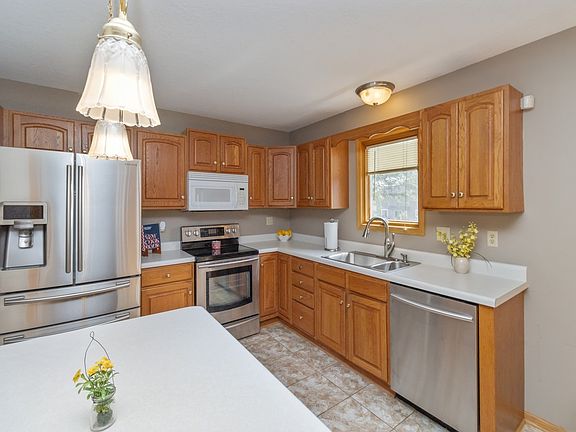 Welcome to this charming 4-bedroom, two-story home, ideally located less than 1/2 mile from beautiful Easter Lake Park, complete with playgrounds, picnic shelters, and scenic walking and biking paths. The inviting front porch welcomes you into a cozy living space, perfect for enjoying your morning coffee. Inside, the living room features a gas fireplace framed by built-in bookshelves, creating a warm and inviting setting for gatherings. The home boasts both a formal dining room and a bright, eat-in kitchen with sliding glass doors that open to the deck and patio, making outdoor entertaining a breeze. The fully fenced backyard provides privacy and a peaceful space for pets, play, or quiet evenings. The finished lower level offers additional living space, perfect for a home office, gym, or recreational room. Combining comfort, charm, and a prime location, this home is a must-see. Schedule a showing today!
