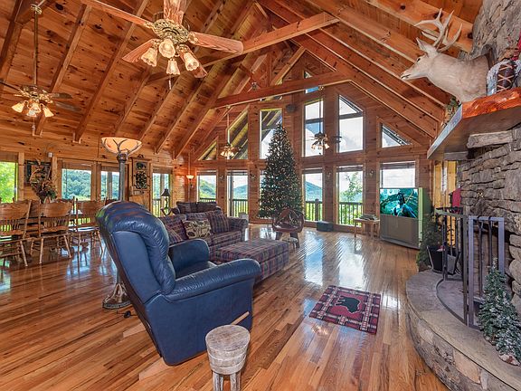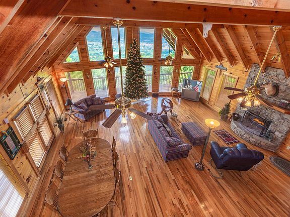 Breathtaking sweeping view of Wears Valley & the mountains! Rare find in a log cabin w/ garage. Perfect for permanent home or rental. Upper and lower decks have 180 views of Wears Valley. Open living/dining/kitchen (roomy for cabin) w/ floor to ceiling wall of windows, stone WB FP, & cathedral ceilings. Exceptional entertaining space w/ double doors on upper & lower levels opening onto the wide wrap around porch. Spacious master suite w/ 3 closets & ensuite w/ jetted tub, dual vanities, & walk-in shower. Upstairs boasts a loft BR overlooking the main living area w/ closet and stunning views. 2 BRs & full bath. Downstairs opens up to separate living quarters, including great room w/ pool table, kitchenette, stone woodburning FP, laundry, 2 optional purpose rooms w/ closets, but no windows. Extra-security system & cameras, Nest thermostats, corian countertops, water tx system, furniture, wood blinds, pool table, BDry system, upgraded septic, full water filtration, 1500 gallon water holding tank, shut off system, new landscaping. Private hot tub space. Could easily sleep 16 (or more) w/ sleeper sofas.