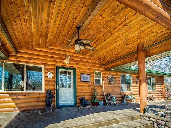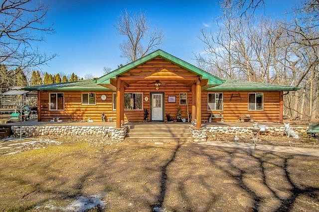 Your dream of living in the Northwoods can be a REALITY! Stunning log cabin style ranch complete with log timber-columned grand portico and beautiful stonework, this 4 bedroom, 1.5 bath, 3.5 car garage, RANCH home is surrounded by 5 WOODED ACRES! A 2.5 car detached garage with furnace and electric plus a 1 car basement drive-out garage for all the toys! Wrap-around deck to enjoy your own private nature preserve, stunning hardwood floors with a log home interior finish but with all the modern conveniences. Kitchen includes granite countertops and stainless-steel appliances. LOW County Taxes add to the PERFECTION, don't let this one go!