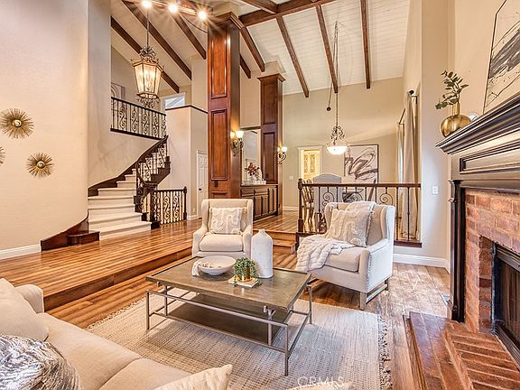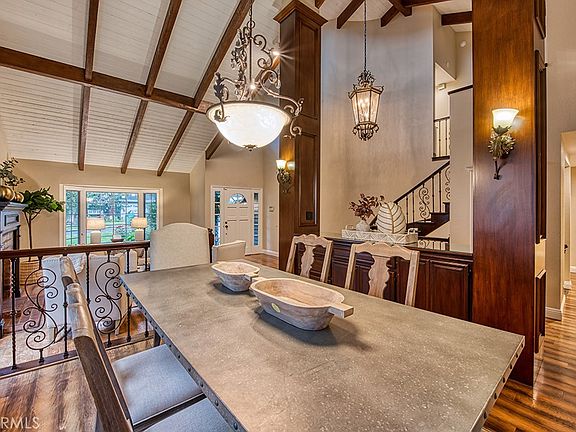 Welcome to 31582 Via Coyote, a quintessential Village home behind the gates of Coto de Caza. Offering 4 bedrooms plus an office and 4.5 bathrooms, this property boasts beautiful character at every turn. Situated on a fantastic lot, the expansive backyard offers gorgeous greenbelt views and plenty of space for outdoor entertaining. From the front patio, step inside and you are greeted by vaulted wood beamed ceilings that adorn the formal entryway and living room. The family room sits just off the kitchen and provides a warm atmosphere by the fireplace. The kitchen features granite countertops, recessed lighting and antique white cabinetry. A powder, formal dining room, private office/den, and access to the spacious 2-car garage completes the main level. Upstairs you'll find a large Primary Suite with vaulted ceilings, a walk-in closet, a spacious en-suite and a balcony overlooking the tranquil landscape. Down the hall are two secondary bedrooms connected by an office nook and each have an attached bath. On the bottom floor, you will find an additional room that has a full bath, built-in TV, surround sound, wine cellar and access to the backyard. Don't miss the opportunity to call this beautiful home yours in the sought-after Village neighborhood of Coto de Caza!