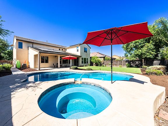 This stunning Clovis home w/ 3,153 sq ft home with 5 bedrooms, 3 baths on a 8,960 sf lot in Clovis has a Formal Living Room, Formal Dining space, spacious Den and a large kitchen with walk in pantry and breakfast nook. From the moment you enter the high ceilings and decorative stair railing draw you into the formal living and dining space. Continue to the family room where you will find a fireplace, large windows that allow natural light. The kitchen features a granite counters, pantry, separate stove / oven/ microwave and lots of counter space. One bedroom/bath are located downstairs, the other bedrooms upstairs as well as a large laundry room w/sink & flex room. The main bath has a separate tub/shower and a walk in closet with organizers. Outdoors is a covered patio with fans, grass area and swimming pool with separate spa. The 3 car garage has an EV Charging outlet for your electric car. Solar Lease with 34 panels, 11.04KW, .18/dw help power this home. Call today to see this home!