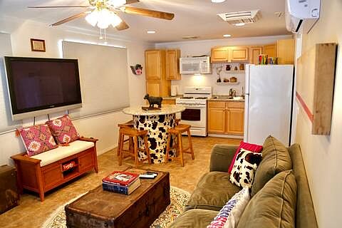 This is a lovely one bedroom apartment in beautiful Borrego Springs. It features a serene bedroom, bathroom, kitchen and living area along with a private backyard. There is also a common area with a swimming pool, tons of open space, and a garage with laundry and games. There is also a jacuzzi in the backyard which can be activated for an additional monthly fee. The apartment is adjacent to another apartment (the two units share a wall). The property also features a tennis court (with pickleball option) and beautiful night sky views. The property is a 10 minute bike ride from downtown Borrego Springs. The apartment is fully furnished and utilities are included in the rent price. Month to month (for now, but this is negotiable)