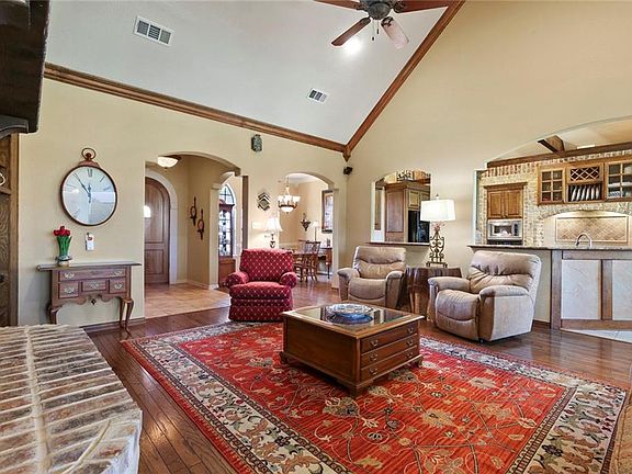 Exceptional 4 bed, 3 bath custom home located in Ashmore Farms addition, Haslet, TX. This beautifully landscaped home greets you with an oversized yard & extended walkway. Inside you'll find vaulted ceilings with open living area that graciously flows into dining room, kitchen and breakfast nook. Large eat-in kitchen boasts granite counter tops, exposed beams, built in oven, microwave and walk-in pantry. Vaulted ceilings in master coupled with ensuite bath which includes dual sinks and soaking tub. Large upstairs flex space perfect for entertainment or media. Addt'l features include 3 car oversized garage, ext. accent lighting, solar operated driveway gate, screened patio, irrigation system, and walk in attic.