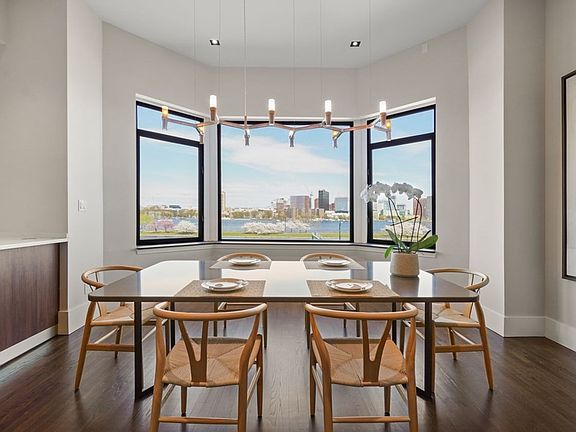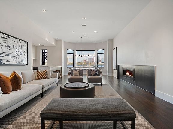 This rarely offered high-end, professionally designed 2 bed+ large study home has picturesque views of the Charles River Lagoon and beautiful custom furniture. Direct access elevator leads to the grand living room with high ceiling and modern gas fireplace. Beautiful 2 toned kitchen features Miele wine fridge and stove. Custom brass finish glass doors enclose the office/ guest room with with pullout sofa and office setup. Large sunny primary-suite with oversized bay windows, wallpaper throughout, spa-like bathroom with steam shower and Toto smart toilet. Luxurious second bath with a large soaking tub. Brand new central heating and cooling.