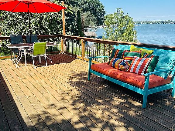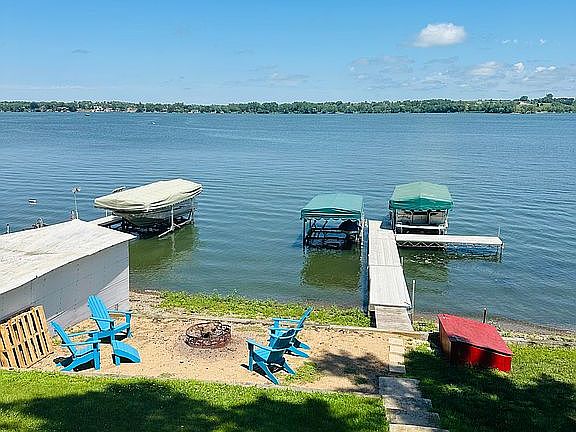 Gorgeous lake front property. Large lot and beach plus sand pit/fire pit area. Large storage shed. Also boat house on the water. Dock and lifts included. Most desirable side of the lake - south side. Custom wood floors, custom cabinets, vaulted ceilings. Year round - heat and cooling units. All beds, couches, tables, armoire, chairs included. Decor and boats negotiable. Lilly pad, water skis, paddle board, small kayaks, Jetski and pontoon also negotiable. 65” smart tv also included. All appliances including washer and dryer, refrigerator, stove and microwave and hood and dishwasher included.