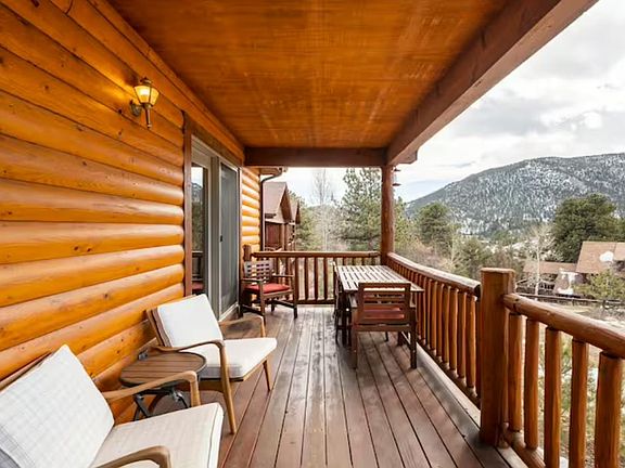The spacious deck includes an extendable dining table, additional seating area, and beautiful mountain views.