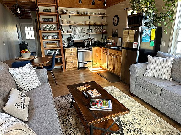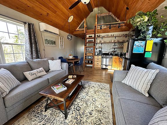 We are selling our cute bungalow style cottage, which was built in 2017, and sits on a 3.34 acre wooded lot. This adorable property is currently being used as a short-term rental (vacation property) and will be sold fully furnished, so that it may provide a potential turn-key income opportunity for its buyer. An open living room/kitchen floor plan makes this small dwelling feel much bigger. Loft spaces allow for an extra sleeping space and sitting area. An outdoor building houses the hot water heater and well pump.
