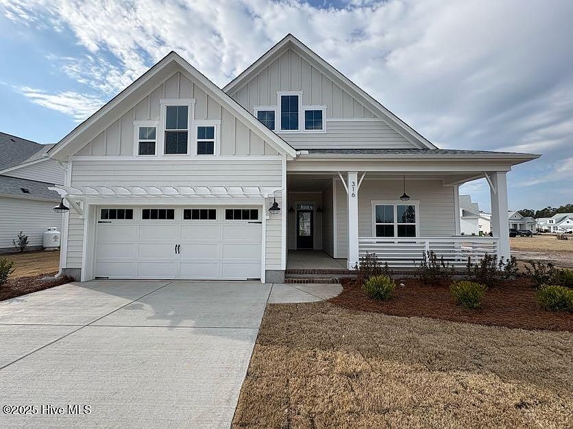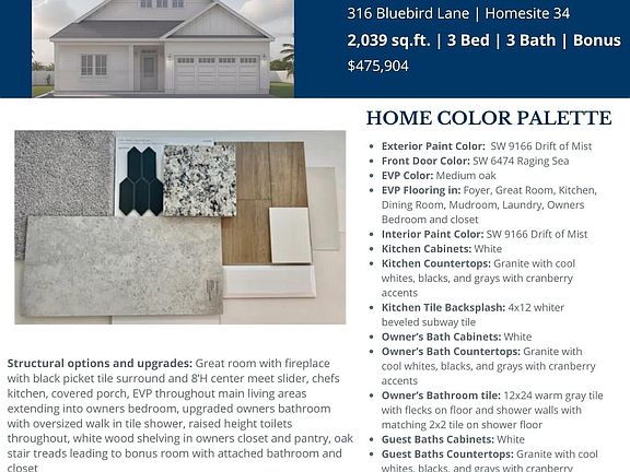 Songbird Landing in Hampstead introduces the wonderful Kauai Home Plan in the Coastal Elevation. The Kauai is a welcoming 2039 sq. ft. home with 3 bedrooms, 3 bathrooms and a bonus room. Upgrades include the great room with fireplace with black picket tile surround and 8'H center meet slider, chefs kitchen, covered porch, EVP throughout main living areas extending into owners bedroom, upgraded owners bathroom with oversized walk in tile shower, raised height toilets throughout, white wood shelving in owners closet and pantry, oak stair treads leading to bonus room with attached bathroom and closet.