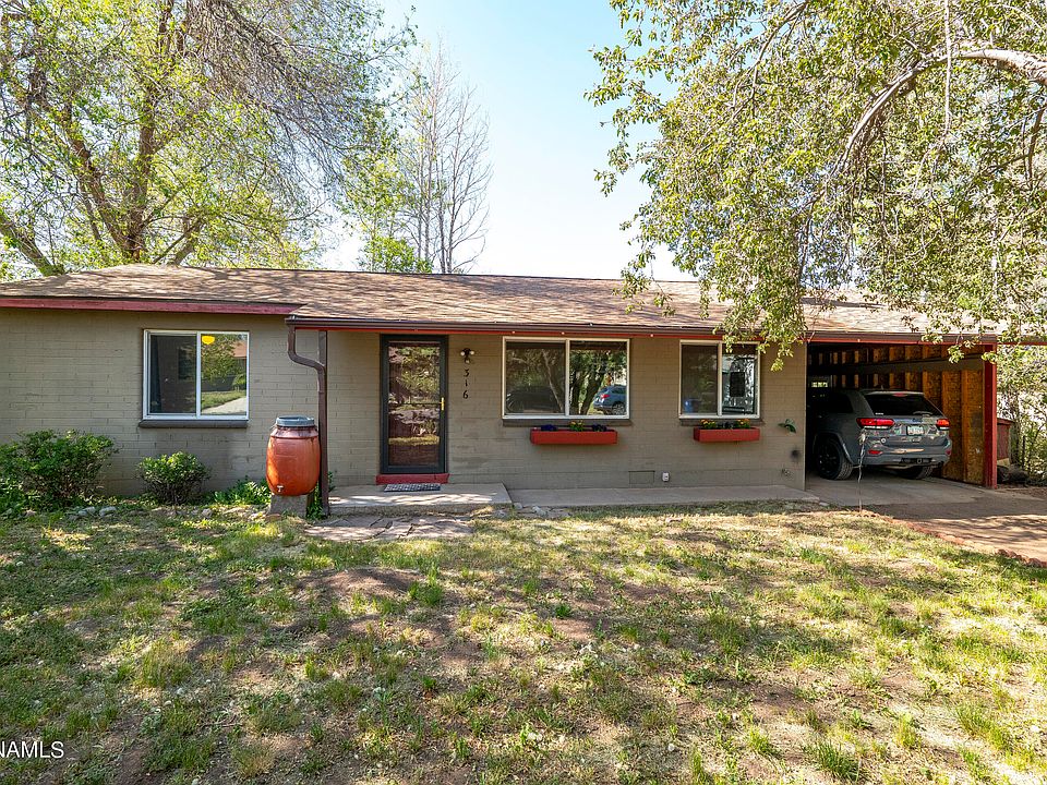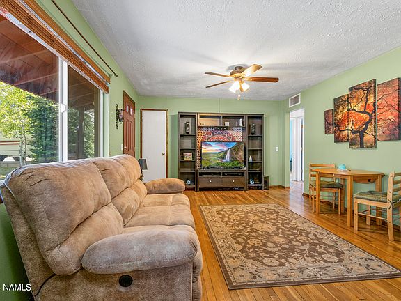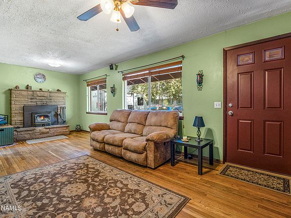 Adorable and Affordable single level in Bow and Arrow. This 3 bedroom/1.5 bathroom has great natural light, updated windows & a new roof! Gorgeous original wood floors & cozy wood stove adorn the living area. You'll love the hickory cabinets & counter space in the kitchen. Fridge & washer/dryer convey with the house. Bonus half bath is located off of the laundry area. The spacious, fully fenced & level backyard has a trex deck perfect for entertaining, plus a walk-in storage shed. Fruit trees, wooden swing and window flower boxes add charm and curb appeal. Great location close to NAU, trails, National forest and there's NO HOA. Single car covered carport & extra room to park cars in the driveway.