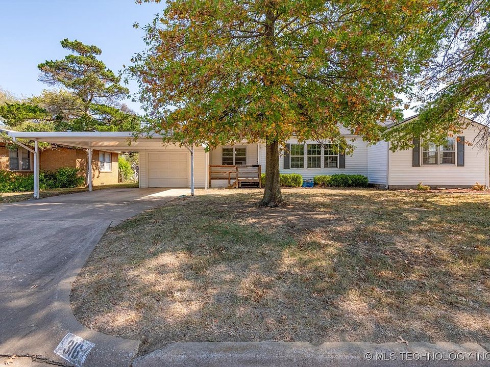 Darling two bedroom one bath well maintained home with large fenced-in backyard, perfect for get-togethers or gardening. The warm and inviting living room greets you as you walk through the front door, with a generous sized formal dining room complete with built-in shelves leading to the spacious kitchen with cozy breakfast nook. Large work area in the back of the garage, two car carport, as well as a partial basement storm shelter. Carpeting was removed to reveal the original hardwood floors throughout the living space and bedrooms. Brand new roof, water heater, and neutral interior paint in 2024. Bathroom was remodeled in 2021. You don’t want to miss the chance to see this gem!