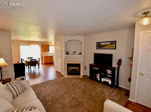 Sparkling clean three-bedroom ground floor condo close to Peterson SFB. One level living with a one car attached garage and one parking space in front of the garage. Living room has a beautiful gas fireplace that was recently serviced and had a blower added for heat efficiency. Kitchen includes a large island and plenty of cabinet and counter space as well as a pantry. Living room carpet newer, like brand new. Kitchen, dining area, hallway and one bedroom flooring all brand new vinyl planking. All new blinds, new water heater, furnace recently serviced, washer and dryer hook ups with gas and electric hook ups. Walkout kitchen/dining area to your concrete patio and to the well-maintained common area and playground.