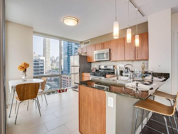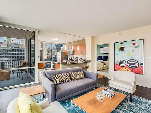 Luxurious full amenity building with 24/7 door staff, rooftop deck, outdoor pool, and fitness center! Unit features floor to ceiling windows, and in unit washer and dryer! Pets welcome!