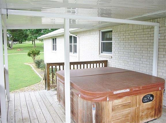BEAUTIFUL in every respect! Over 2000 square feet and all roomy spaces in this all brick on paved road in quiet location only 2 blocks to Bull Shoals Lake. 2 large bedrooms, 2 ½ baths, spacious living room, plus family room w/ fireplace, great laundry, coffered ceilings, walk in closets. Super outdoor living w/ covered deck with Hot Springs spa tub, 1-1/2 lots, great landscaping, even a workshop. Great to show!