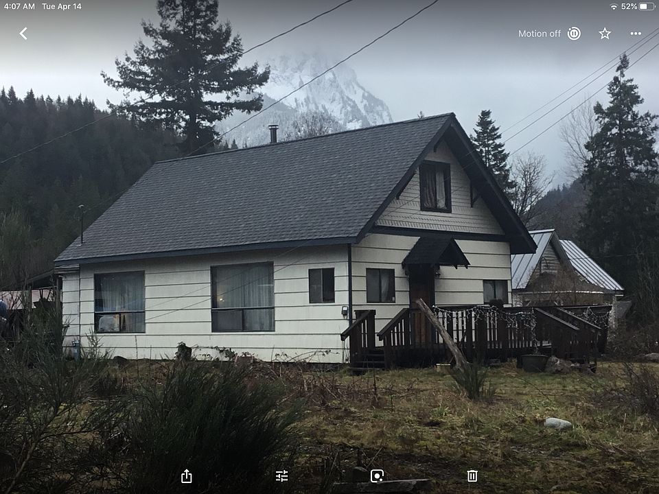 Small but not tiny bedrooms. Kitchen very spacious, lots of cabinet space and small pantry. Living room mediumish with large picture windows. Every room has beatiful mountain view. Nice back patio with gardens, detached garage. Large front deck. Lots of parking.