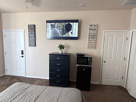 This is a gated seperate room connected to a townhouse in Championsgate with private entrance and private full bathroom and large closet. The unit comes fully furnished Bed and dresser and nightstand chair 55" tv with fast speed internet digital entry lock. It has a small fridge with freezer. An also a microwave an induction stove top. Water and light included in rent. There is a community has a lake and pool an parking onsite available. We are located 10 minutes from Disney and 20 from Universal Studios and SeaWorld. We are conveniently located close all major restaurants and stores. 5 minutes to I4 The lease term is for 6 months. The lease is for one person if it's for a couple then the rent goes up by $150