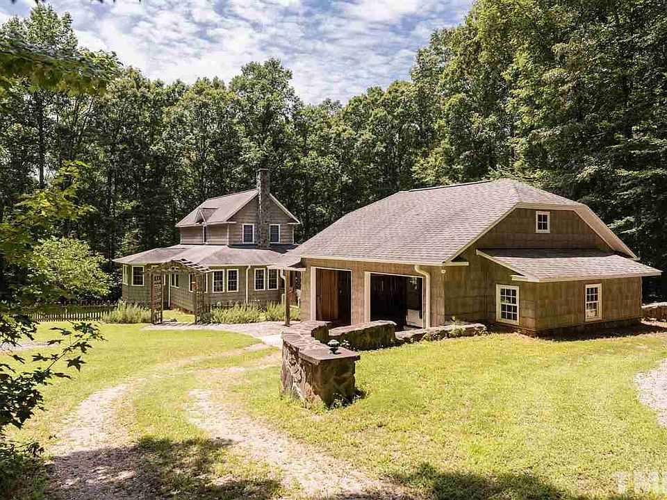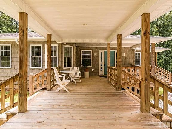 This unique custom built home sits on a private 2.4 acre wooded lot that backs to protected forest and located on a peninsula to Falls Lake. Inviting covered frnt porch w/ breezeway leads to drive thru garage. Ktchn is open to GR and DR with 2 ovens, SS appls, wlk-in pantry, sep. prep sink. FR is bright and airy with multi windows, wood flrs, 3 sided gas fp. 1st flr mstr bdrm has two wlk-in closets, 1st flr office has built-in cabinets and french drs. Expansive covered back porch looks out to wooded yard.
