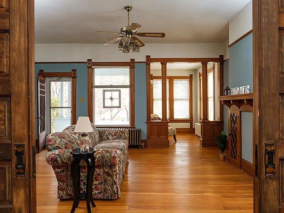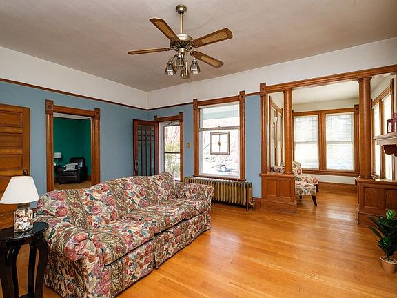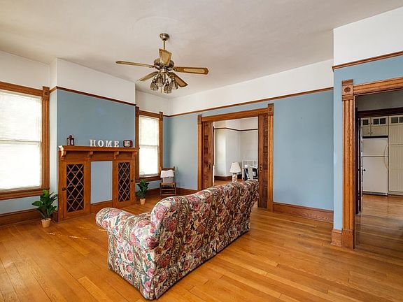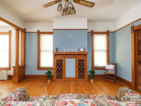 A home with character and historic charm, this 1914 home is a classic example of a well-loved home. The welcoming deep covered front porch wraps around to the side providing an expansive outdoor living space. Step inside to a warm and inviting interior of hardwood flooring, extensive custom trim work and moldings, pocket doors, oversized windows and tall ceilings throughout. Spacious living room with separate sun-filled sitting area, large dining room with built in corner cabinet, updated kitchen with Kraftmaid cabinetry, Corian countertops, pressed tin ceiling, bay window at the kitchen sink and a huge walk-in pantry. First floor master with half bath also on the first floor. Upstairs are two nice-sized bedrooms with walk in closets. A full hall bath boasts a claw foot tub, thoughtfully designed vanity with make-up area, linen cabinet and oversized walk-in closet. The full basement provides space for washer and dryer, utility sink and great storage space. Outside are two buildings which would be ideal as a garden shed and workshop. Lots of mature native plants in the 1.075 acre yard. Freshly painted exterior and lifetime metal roof.