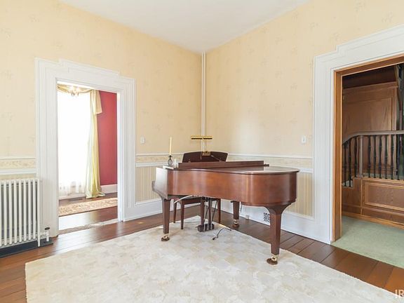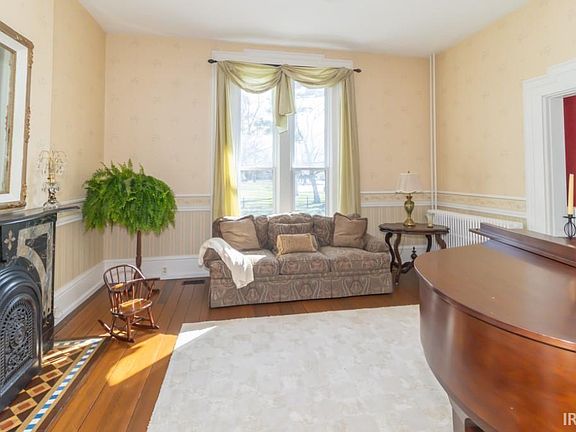 This historic Italianate residence, built in 1867, is brimming with architectural details and modern updates, is in Knightstown, IN close the Historic Hoosier Gym. This home has a very stately street appearance. Walk through the front door to a beautiful formal entry. Throughout the first floor there are 11' ceilings, original woodwork, hardwood floors, and beautiful built-ins. Large windows (replacement) provide lots of natural light. The living room features real wood paneling, brick hearth fireplace, custom built-ins, and a large bay window. The main floor has an office with exterior door, or this could be a bedroom (no. 5) on the main level. The kitchen has been tastefully upgraded, with quartz counter tops, custom cabinetry (pull out shelving), butcher block island, high end appliances, breakfast nook with fireplace and main level laundry space. Two staircases, one formal off the living room. The other is a back stairway that leads to and from the kitchen. Formal dining room with wainscotting, large family room and a full bath (updated) finish out the first floor. 4 large bedrooms with a full bath are upstairs. All bedrooms have high ceilings, large windows, and hardwood floors. There is a large detached garage with work space and storage accompanied by a nice backyard space. Plenty of off-street parking, central air, new roof, full basement. Truly a special home that you must see to appreciate. This home is located just 50 miles to the Indianapolis Airport, and 40 miles to downtown Indianapolis.